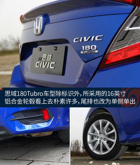 隨著思鉑睿混動車型的推出,這次走入門路線的思域1.0T也來打了個醬油。跟之前的1.5T車型相比,外形基本保持一致。鑒于其更入門的定位,輪轂的樣式看起來沒那么精致和動感了,尾排改為了單側(cè)單出的設(shè)計,車尾的動力標識也有之前的“220TURBO”改為“180TURBO”。