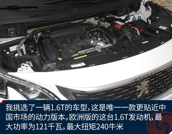所以我挑選了一輛1.6T的車型,這是唯一一款更貼近中國(guó)市場(chǎng)的動(dòng)力版本。歐洲版的這臺(tái)1.6T發(fā)動(dòng)機(jī),最大功率為121千瓦,最大扭矩240牛米,大概相當(dāng)于國(guó)內(nèi)標(biāo)致4008 1.6T的350THP版本。