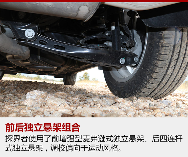 探界者的底盤受到雪佛蘭運(yùn)動(dòng)傾向的影響,被調(diào)校的有些偏硬,這樣對(duì)于車身側(cè)傾的抑制就非常到位,面對(duì)路面上連續(xù)的起伏,緊致的懸架也帶來很強(qiáng)的整體感。但是當(dāng)面對(duì)較大的顛簸或者減速帶一類的時(shí)候,車身就會(huì)產(chǎn)生彈跳的感覺,而且懸架的回彈稍有延遲,總有一次小幅度的二次彈跳,稍稍影響了舒適性。