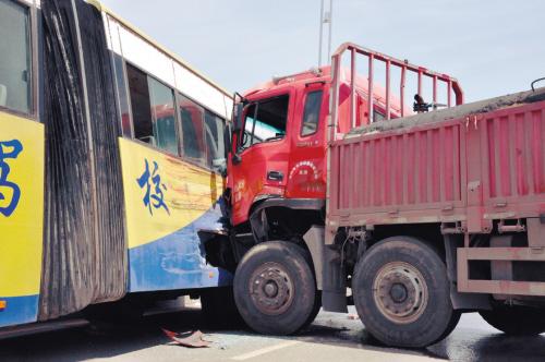 ????????昨日12時(shí)許,記者趕到事發(fā)地點(diǎn):渾南西路與沈蘇西路交會(huì)處的渾河站橋。只見(jiàn)一輛紅色車(chē)身的運(yùn)水罐車(chē)與一輛藍(lán)黃相間的大客車(chē)相撞!