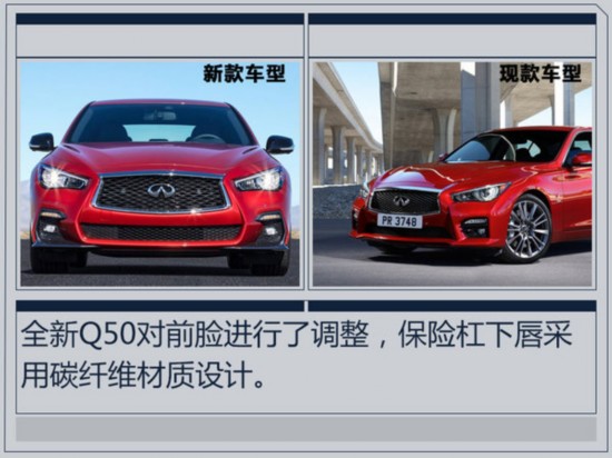 全新英菲尼迪Q50對外觀進(jìn)行了調(diào)整,前臉采用上下分體式格柵設(shè)計,上格柵為網(wǎng)狀造型,保險杠下唇為碳纖維材質(zhì)。車尾取消了車牌下方鍍鉻飾條以及兩側(cè)反光板,下方保險杠換裝黑紅雙色護(hù)板。
