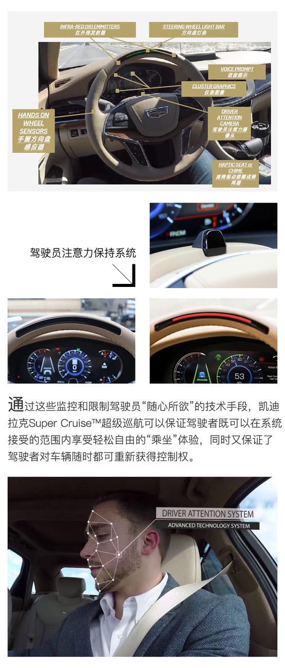 ????????但問題是,當一臺車自己好好的行駛在高速公路上,人性驅(qū)使下的駕駛員很容易把注意力轉(zhuǎn)移到其它地方,這就造成了極大的安全隱患。所以凱迪拉克Super Cruise?超級巡航系統(tǒng)最與眾不同的地方,也是讓我覺得最有價推廣價值的設(shè)計理念,是通過駕駛員注意力保持系統(tǒng)與高精度地圖數(shù)據(jù)緊密結(jié)合?,主動監(jiān)測駕駛員的狀態(tài)并做出及時回應。這套系統(tǒng)能督促駕駛者始終保持對車輛運行狀態(tài)的有效監(jiān)控,這給其釋放雙手的駕駛輔助功能帶來更安全、更自信的使用體驗。