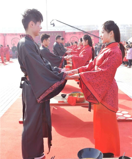 記者在現(xiàn)場(chǎng)看到,16對(duì)新人在司儀的引導(dǎo)下,采用中國(guó)古典婚禮儀式,有牽紅線、結(jié)發(fā)、拜天地等程序,儀式簡(jiǎn)單而隆重,新人家屬、1000多名市民圍觀見(jiàn)證了新人喜結(jié)連理。