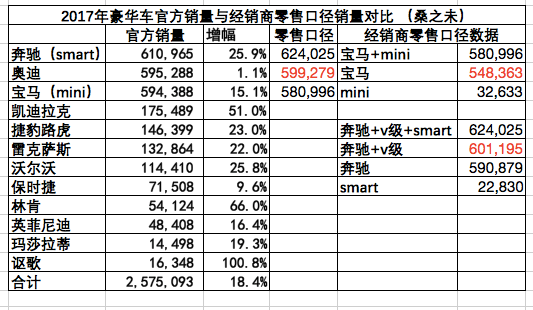如果以經(jīng)銷(xiāo)商終端零售口徑統(tǒng)計(jì),奔馳(含smart)2017年銷(xiāo)量為624,025輛,其中奔馳品牌(含v級(jí)車(chē))為601,195輛;奧迪品牌為599,279輛;寶馬(含Mini)為580,996輛,其中寶馬品牌為548,363輛;如果以經(jīng)銷(xiāo)商終端零售口徑計(jì)算,奔馳品牌(含v級(jí)車(chē))在2017年豪華車(chē)終端零售市場(chǎng)獲得銷(xiāo)售冠軍。