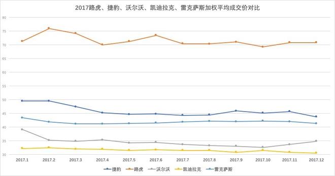 凱迪拉克、捷豹路虎、雷克薩斯、沃爾沃四個(gè)品牌銷(xiāo)量在10萬(wàn)輛以上為第二陣營(yíng)。除路虎外,捷豹因進(jìn)口F-pace帶動(dòng)其成交價(jià)上揚(yáng),隨著XE國(guó)產(chǎn)上市銷(xiāo)售,捷豹銷(xiāo)量有望進(jìn)一步增長(zhǎng),價(jià)格進(jìn)一步下探;以銷(xiāo)售進(jìn)口車(chē)型為主的雷克薩斯,今年銷(xiāo)量質(zhì)量不錯(cuò),庫(kù)存時(shí)間短,資金周轉(zhuǎn)快,多數(shù)以訂單方式銷(xiāo)售,加權(quán)平均價(jià)在42萬(wàn)上下,成交價(jià)格走勢(shì)平穩(wěn),經(jīng)銷(xiāo)商今年利潤(rùn)也很豐厚。沃爾沃在新款車(chē)型的帶動(dòng)下,成交價(jià)格開(kāi)始上揚(yáng);凱迪拉克今年銷(xiāo)量增速較快,通過(guò)下圖我們可以看到,凱迪拉克基本依靠低價(jià)獲取銷(xiāo)量的增長(zhǎng),成交價(jià)格進(jìn)一步走低,經(jīng)銷(xiāo)商的利潤(rùn)需要依靠廠家補(bǔ)貼。
