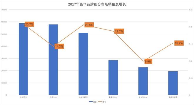 2017年豪華車(chē)市場(chǎng)中六大細(xì)分市場(chǎng)(中大型轎車(chē)、中型轎車(chē)、緊湊型轎車(chē)、中大型SUV、中型SUV、緊湊型SUV)占據(jù)豪華車(chē)全年93%的銷(xiāo)量,環(huán)比增長(zhǎng)17.3%,市場(chǎng)集中度進(jìn)一步提升;豪華車(chē)企業(yè)如果想與市場(chǎng)同步增長(zhǎng),就不得不在這個(gè)六個(gè)細(xì)分市場(chǎng)投放車(chē)型,并提升產(chǎn)品競(jìng)爭(zhēng)力。