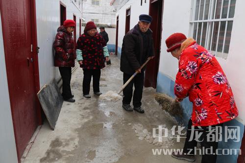 記者看到,一位老人正在用木棍敲打屋檐上垂下的“冰棍“,以免“冰棍”落下傷人,還有幾位老人在清掃剩下的一點點積雪,他們有說有笑,很是熱鬧,場面煞是溫馨。
