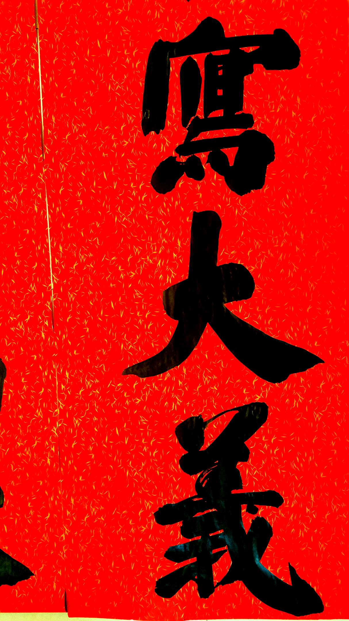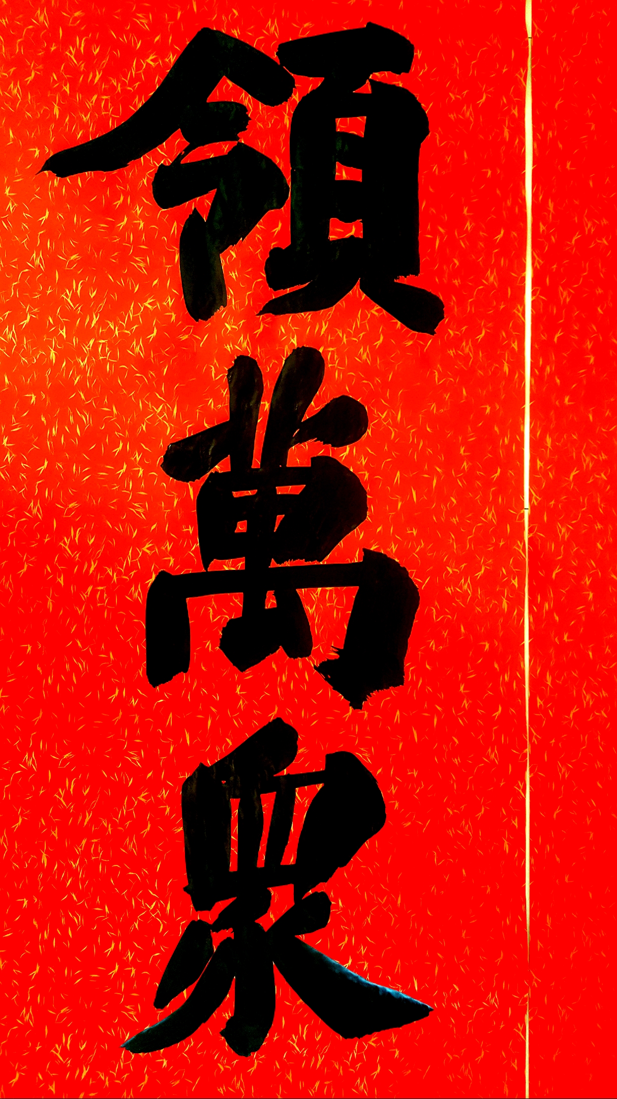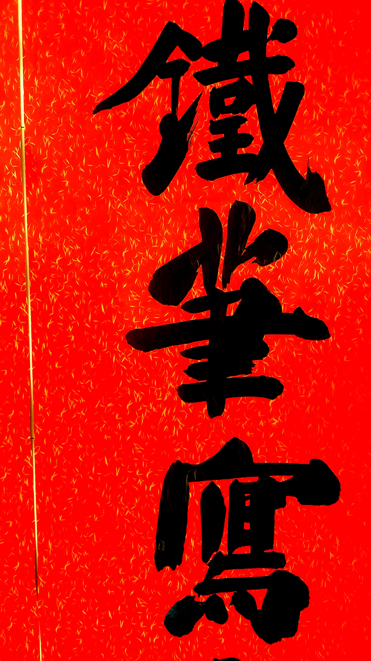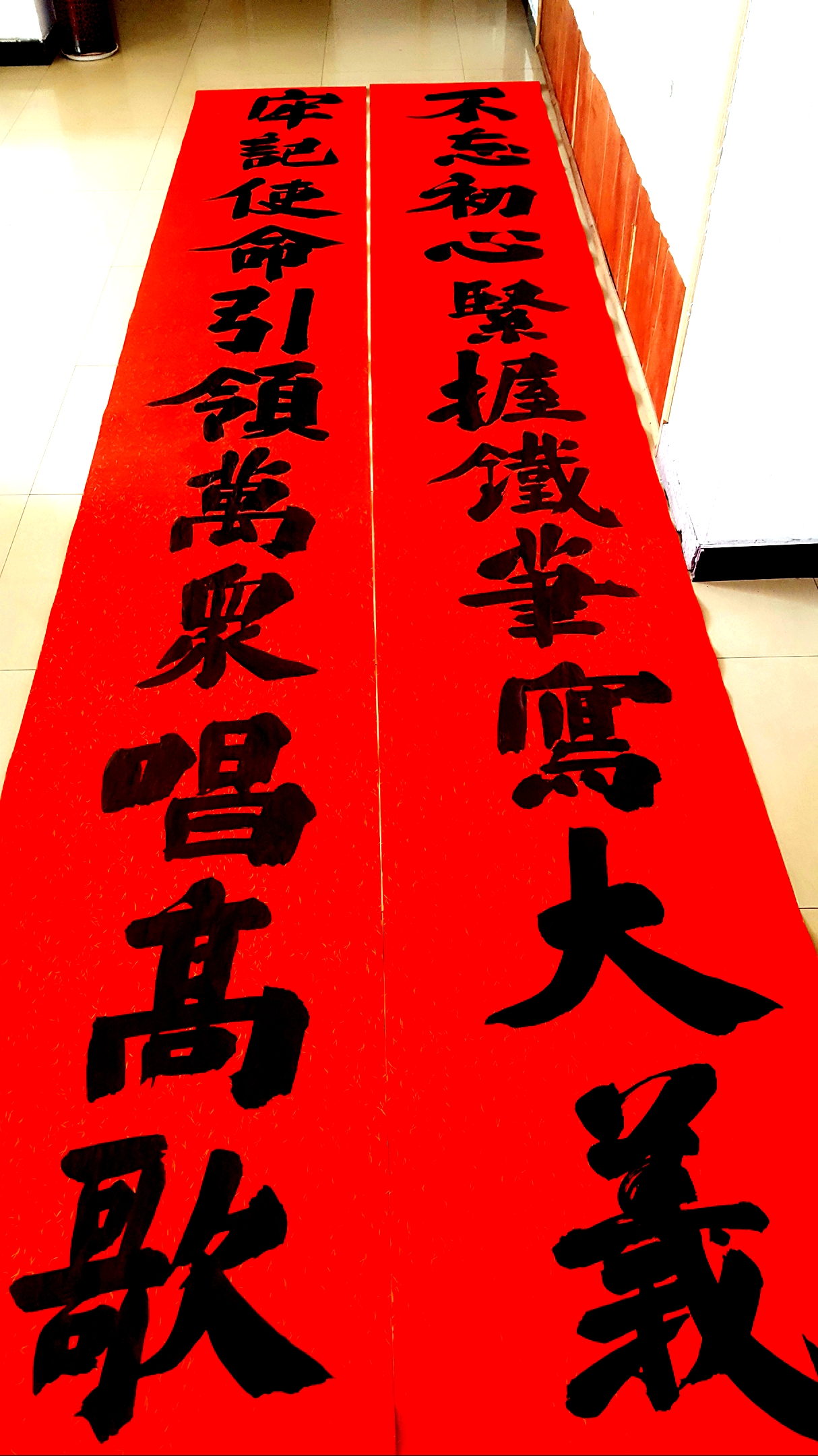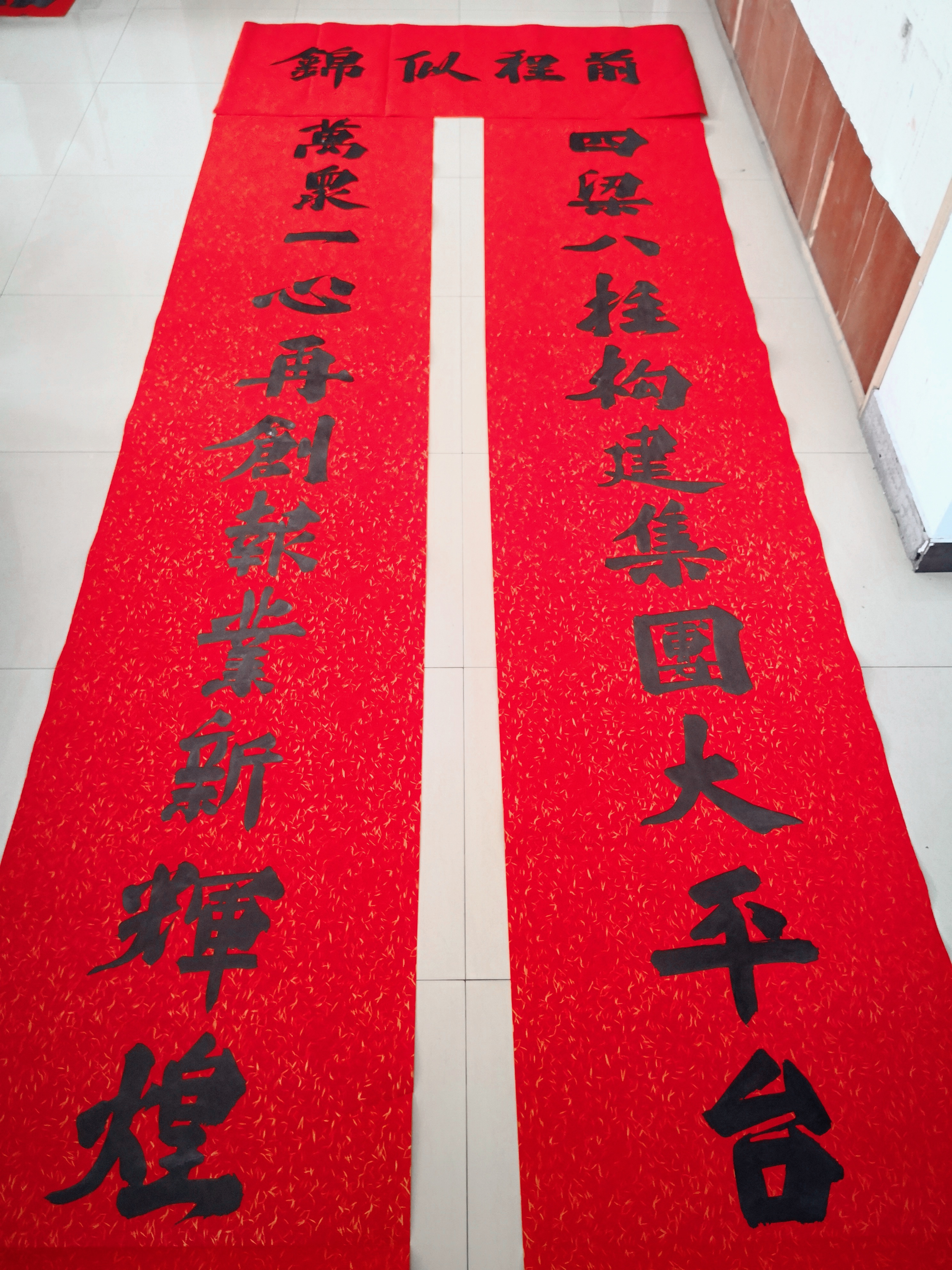 邢懷章以歐陽通筆法融合魏碑,大楷榜書創(chuàng)作而成,春聯(lián)長達(dá)5米,每字徑80公分左右,一氣呵成,不計工拙,近兩個小時完成兩幅巨型春聯(lián),表達(dá)了對周口報業(yè)集團(tuán)的祝福,映出了喜慶的年味。