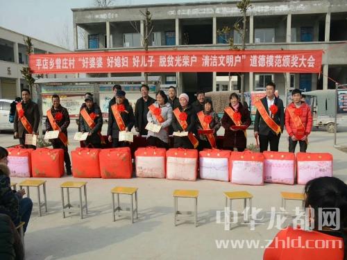 中華龍都網(wǎng)訊(周口報業(yè)全媒體記者 付永奇 趙永昌 文/圖))2月10日下午,商水縣平店鄉(xiāng)曾莊小學操場內(nèi),人頭攢動、熱鬧非凡,村里評選出來的10位好婆婆、好媳婦、好兒子、清潔文明戶、脫貧光榮戶等“五好”群眾代表身披綬帶、胸戴紅花,臉上都洋溢著幸福的喜悅;一些民間文藝團體分別助興表演了挑花籃、扇子舞、廣場舞等喜慶的節(jié)目,把現(xiàn)場氣氛烘托得異常隆重熱烈。“為弘揚社會公德、家庭美德,提升群眾素質(zhì)和文明程度,春節(jié)來臨之際我們召開‘五好’表彰大會,下面有請鄉(xiāng)黨委副書記、鄉(xiāng)長徐汝濤給大家講話......”隨著主持人、鄉(xiāng)紀委書記劉新光的開場白,臺下響起了一陣熱烈的掌聲?!伴_展好婆婆、好媳婦、好兒子、清潔文明戶、脫貧光榮戶等模范家庭人物評選是我鄉(xiāng)精神文明建設工作的一項重大舉措,也是脫貧攻堅、農(nóng)村人居環(huán)境整治、文明鄉(xiāng)風提升的部分內(nèi)容,更是弘揚孝親敬老、勤勞致富、講究衛(wèi)生等優(yōu)良傳統(tǒng)的需要。全鄉(xiāng)各村都要通過召開評選表彰大會,引導廣大人民群眾學先進、爭先進,為文明和諧平店建設做出更大的貢獻......”徐汝濤提出殷切的希望。曾莊行政村“兩委”成員、駐村工作隊、第一書記及部分群眾200余人參加了會議。與會領導為此次層層推薦評選出的好婆婆、好媳婦、好兒子、清潔文明戶、脫貧光榮戶頒發(fā)了榮譽證書和獎品。據(jù)村支部書記曾紀靈介紹,這些“五好”模范都有感人的故事,或是講究衛(wèi)生、勤儉持家,孝老敬親、患難與共;或是鄰里互助、脫貧致富;他們用實際行動證明了自己對文明風尚的價值追求,在生活中書寫了一個個接地氣的好故事,為廣大家庭樹立了好榜樣。受表彰的好婆婆胡秀英說:“把媳婦當閨女,啥時候也不會吵架生氣......”清潔文明戶朱國申說:“農(nóng)村環(huán)境臟亂差,咱要帶頭改變它......”脫貧光榮戶劉前進說:“國家扶貧政策好,不如早點摘掉貧困帽!”