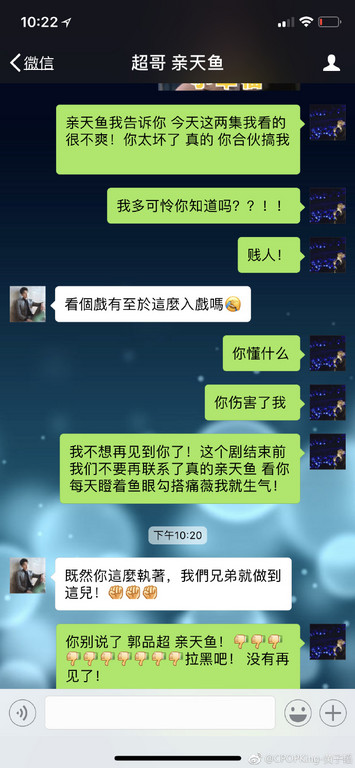 黃子韜12日在微博上分享一張與郭品超的對話截圖,并在發(fā)文中生氣地寫道:“什么都不用說了!拉黑吧!”他似乎是在看了最新播出的2集《談判官》后,為自己劇中的遭遇感到憤憤不平,立刻找郭品超算賬直呼:“親天魚(秦天宇,郭品超劇中角色)我告訴你,今天這兩集我看的很不爽!你太壞了,真的,你合伙搞我。我多可憐你知道嗎?!賤人!”