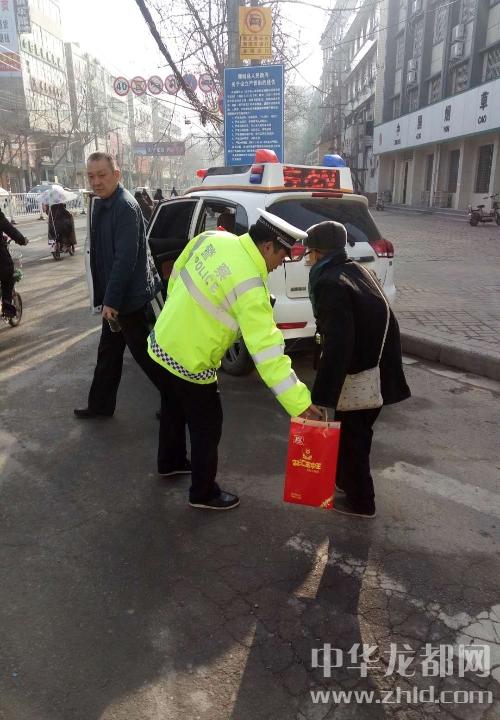 3月10日早上,鄲城縣交警大隊城市一中隊隊長范慶華、指導(dǎo)員徐錕帶隊按照日常工作安排,在新華路與文化路口站崗執(zhí)勤時,看到一位腿腳不便的八旬老人拄著拐杖,手里還提著一箱火腿腸,行動非常緩慢來到路口。