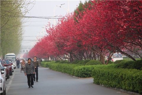 楊樹、垂柳、法桐,這是常見的綠化樹,可是你見過整條道路用桃樹做綠化的嗎?在周口市建設(shè)大道西段,長達1公里的主干道兩側(cè)種滿桃樹?,F(xiàn)在正值陽春三月桃花盛開,整條道路成了一片花的海洋,儼然是鬧市區(qū)里的世外桃源。