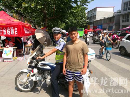 6月7日下午2時20分,周口市公安局交通管理支隊一大隊民警宋智偉和同事正在位于市區(qū)人民路附近的周口市第二高級中學門口路段疏導交通,因為臨近開考,現場車流量較大。突然一名考生走到宋智偉面前,請求宋智偉幫他攔停車輛載送他回家拿東西。“當時,這名考生語速很快,看起來很緊張。通過詢問得知,他的考試用品和證件遺忘在家里,我當時就選擇駕駛咱們的高考應急服務警用摩托車載送他回家去取考試物品?!彼沃莻フf。