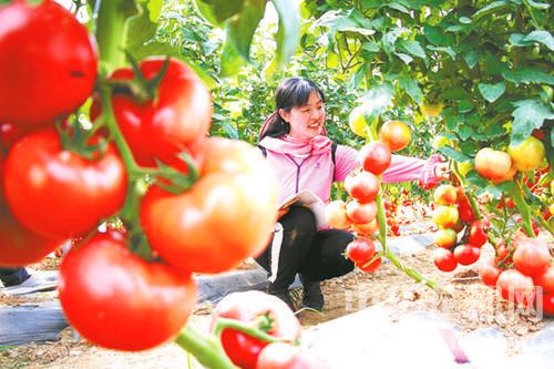 依托河南農(nóng)業(yè)大學(xué)專家團(tuán)隊(duì),扶溝縣蔬菜研究院研發(fā)出400多個(gè)番茄新品種,通過(guò)集中展示讓種植戶優(yōu)中選優(yōu),并實(shí)施對(duì)貧困戶購(gòu)買種苗優(yōu)惠50%、特困戶免費(fèi)供應(yīng)的優(yōu)惠政策,帶動(dòng)206戶貧困戶實(shí)現(xiàn)脫貧。圖為工作人員在記錄番茄新品種的試驗(yàn)數(shù)據(jù)。谷志方 攝