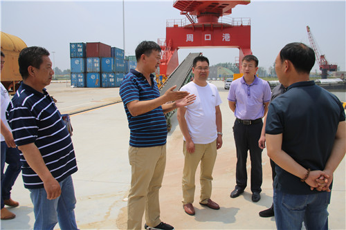 當(dāng)天上午,宿遷市港口發(fā)展有限公司董事長(zhǎng)尤勇、江蘇連云港灌河港國(guó)際港務(wù)有限公司副總經(jīng)理鄒平海攜公司人員來(lái)到周口中心港碼頭,尤勇、鄒平海一行首先參觀中心港碼頭4#5#港池,周口中心港碼頭運(yùn)營(yíng)辦主任段傳奇向他們?cè)敿?xì)介紹了碼頭運(yùn)營(yíng)現(xiàn)狀、吊裝設(shè)備使用情況、圍繞周口中心港打造的多式聯(lián)運(yùn)建設(shè)進(jìn)度和長(zhǎng)遠(yuǎn)規(guī)劃。