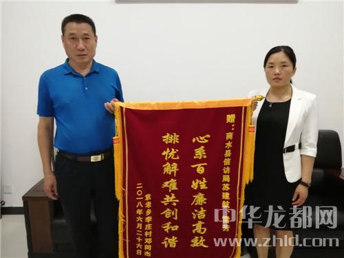 中華龍都網(wǎng)訊(周口報(bào)業(yè)全媒體記者 付永奇 通訊員魏紅 位慶華 )6月26日上午,商水縣信訪局門前鼓樂(lè)喧天、鞭炮齊鳴、人群涌動(dòng)。其間,幾名群眾簇?fù)碇幻嫔蠒靶南蛋傩樟疂嵏咝艖n解難共創(chuàng)和諧”的錦旗徑自向商水縣信訪局走來(lái)。
