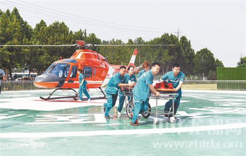 中華龍都網(wǎng)訊 6月28日上午,全市“防災(zāi)減災(zāi)立體救援”航空醫(yī)療救援啟動儀式在周口協(xié)和骨科醫(yī)院啟動??罩芯o急救援一小時內(nèi)全省到達(dá)。圖為直升機(jī)救援演練現(xiàn)場。