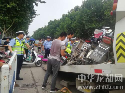 中華龍都網(wǎng)訊 (周口報業(yè)全媒體記者 姬慧洋 陳永團 文/圖)清理違停非機動車、拖走僵尸車、向違停違章機動車輛開出罰單……7月5日,我市中心城區(qū)交通秩序整治“百日行動”首出重拳,對市民深惡痛絕的幾種交通亂象進行治理,拖走非機動車輛76輛,清理“僵尸車”2臺,對多臺違停車輛進行處罰。