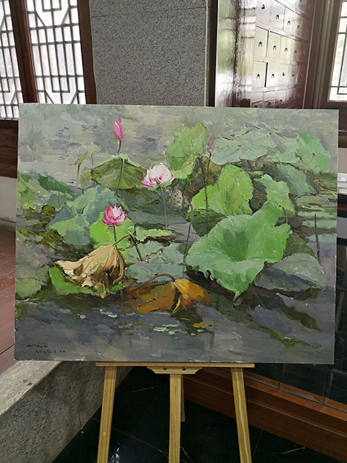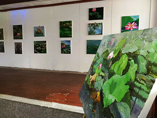 在龍湖荷花盛開的季節(jié),女詩人油畫家三色堇、娜仁琪琪格、愛斐兒、暖玉、白芳芳、劉文文一行6人,來到周口進行寫生觀摩,開展老莊文化交流、伏羲太極文化傳播等公益活動。7月17日上午開展女詩人油畫家寫生作品展,豐富多樣的活動成為淮陽荷花節(jié)一濃墨重彩的一筆。