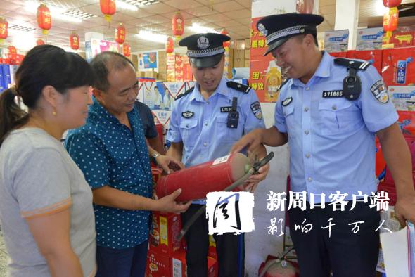 針對(duì)高溫天氣火災(zāi)易發(fā)實(shí)際,扶溝縣公安局呂潭派出所深入開展火災(zāi)隱患排查整治、消防宣傳教育培訓(xùn),從源頭上消除火災(zāi)隱患。圖為8月13日,民警正在檢查超市消防設(shè)施,講解消防常識(shí)。