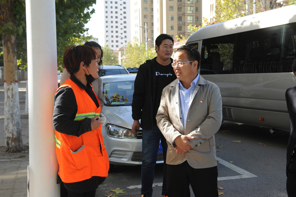 督導中,張建黨親切地與環(huán)衛(wèi)工人進行交談,了解他們的工資收入狀況及是否買了人身保險等情況,并勉勵他們一定要盡職盡責,當好城市的“美容師”。