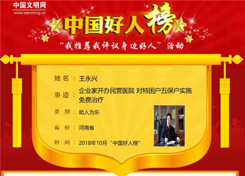 太康縣農(nóng)家出身的王永興熱心公益,累計(jì)投資高達(dá)數(shù)千萬元。10月31日上午,10月中國好人榜發(fā)布儀式暨全國道德模范與身邊好人現(xiàn)場交流活動(dòng)在江蘇連云港舉行,太康縣王永興榮登10月份助人為樂類“中國好人榜”。據(jù)悉,太康縣入選“中國好人榜”人數(shù)已達(dá)42人。