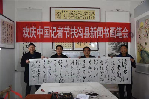 筆墨寫春秋,重彩頌佳節(jié)。為慶祝第19個(gè)中國(guó)記者節(jié),在扶溝縣的張坡詩詞名人書畫館,來自省書法家協(xié)會(huì)的書法家與當(dāng)?shù)匦侣勑麄鞑块T的書畫愛好者們齊聚一堂,以舉行書畫筆會(huì)的形式向新聞媒體人慶賀節(jié)日。