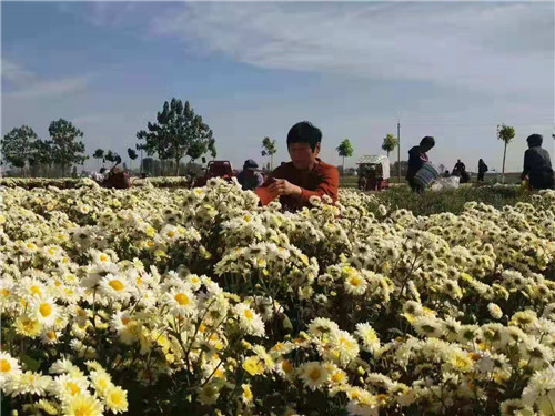 當(dāng)日,位于高集鄉(xiāng)北部的黨橋、雙堂等幾個行政村,也是熱鬧非凡。一臺臺大小不同的車輛,滿載著剛從地里摘下的鮮菊花,正往富甲一方菊花加工廠里銷售,縷縷的菊花清香隨風(fēng)飄來,煞是誘人。在富甲一方合作社帶動下,今年有16戶貧困戶種植80多畝菊花,鄉(xiāng)政府對首次種植的貧困戶負責(zé)技術(shù)培訓(xùn),并給予每畝1000元的生產(chǎn)獎補。今年菊花每公斤4元左右,麥茬種植菊花每畝可產(chǎn)鮮菊1100-1300公斤,去掉雇人摘菊花費用每公斤0.3元,每畝可收入4000-5000元。種植菊花的貧困戶孫建國在富甲一方收購現(xiàn)場,正樂呵呵的數(shù)著賣菊花得來的大把鈔票。