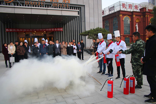在培訓(xùn)現(xiàn)場,為更好地將學(xué)到的知識與實(shí)踐相結(jié)合,大隊(duì)宣傳人員組織參訓(xùn)人員開展了實(shí)地滅火消防演練,酒店全體員工分批次輪番上陣,通過使用滅火器及時迅速地?fù)錅缁馂?zāi)操練,提高參訓(xùn)人員正確規(guī)范使用滅火器材的能力,達(dá)到了良好效果。