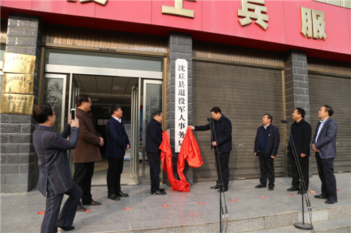 沈丘縣委常委、常務(wù)副縣長郝四春與縣委常委、縣政府黨組成員馬偉共同為縣退役軍人事務(wù)局揭牌。