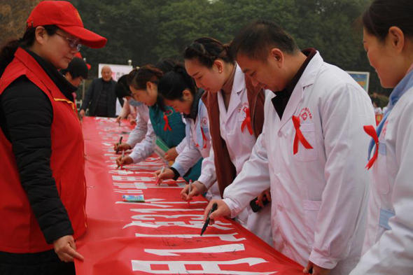 圖為在趕來(lái)參加活動(dòng)的群眾和醫(yī)護(hù)人員共同在預(yù)防艾滋病百米長(zhǎng)卷上簽名。