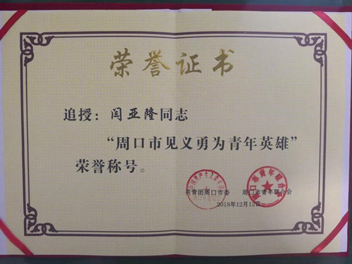 12月13日,記者從鄲城縣團縣委獲悉,為表彰閆亞隆同志的英雄事跡,引導(dǎo)和激勵全市廣大團員青年學(xué)習(xí)他的崇高品格,共青團周口市委、周口市青年聯(lián)合會追授閆亞隆同志“周口市見義勇為青年英雄”稱號。