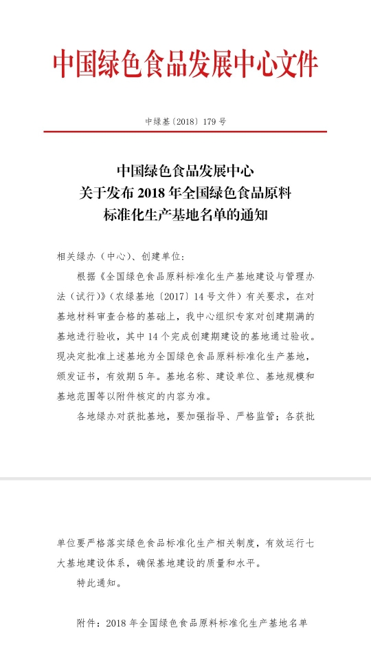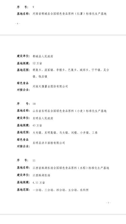 12月30日,中國(guó)綠色食品發(fā)展中心發(fā)布2018年全國(guó)綠色食品原料標(biāo)準(zhǔn)化生產(chǎn)基地名單,全國(guó)14個(gè)申報(bào)的基地獲批,鄲城縣人民政府在胡集鄉(xiāng)、汲冢鎮(zhèn)、李樓鄉(xiāng)、巴集鄉(xiāng)、城郊鄉(xiāng)、寧平鎮(zhèn)、吳臺(tái)鎮(zhèn)、錢(qián)店鎮(zhèn)等8個(gè)鄉(xiāng)鎮(zhèn)建設(shè),河南天豫薯業(yè)有限公司作為對(duì)接企業(yè)的12萬(wàn)畝紅薯種植基地榜上有名。