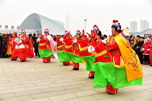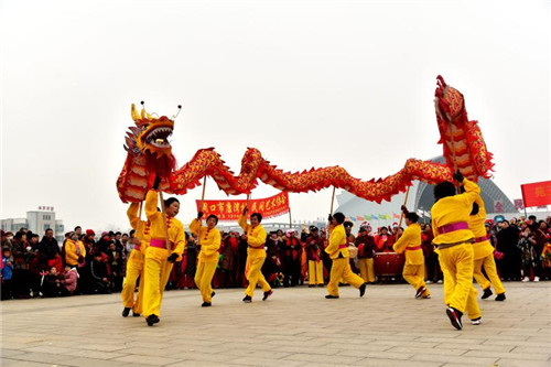 展演現(xiàn)場(chǎng),人頭攢動(dòng),鑼鼓喧囂,16名身穿金黃、亮藍(lán)衣服的舞龍隊(duì)員率先登場(chǎng),金燦燦的巨龍時(shí)而甩尾前行,時(shí)而昂首盤(pán)踞,浩浩蕩蕩;8只舞獅歡騰雀躍、活靈活現(xiàn);精美的裝飾的旱船穿行其中,老生、老旦扮相的隊(duì)員邊走邊唱;整齊劃一的腰鼓隊(duì)以及隊(duì)形優(yōu)美的擔(dān)經(jīng)挑把現(xiàn)場(chǎng)氣氛推向高潮……持續(xù)近2小時(shí)的展演活動(dòng)中,精彩的民俗表演令人目不暇接,為這座城市增添了濃濃的年味。