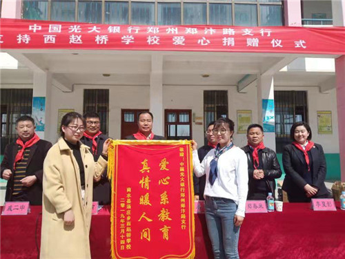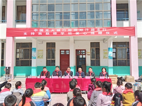 3月14日上午,陽光明媚,春意盎然。中國光大銀行鄭州鄭汴路支行向商水縣湯莊鄉(xiāng)趙橋?qū)W校愛心捐贈儀式在趙橋?qū)W校內(nèi)舉行。河南省委組織部駐西趙橋村第一書記楊永,商水縣教體局負責人鄭春來、湯莊鄉(xiāng)黨委書記潘建甫等出席捐贈儀式。