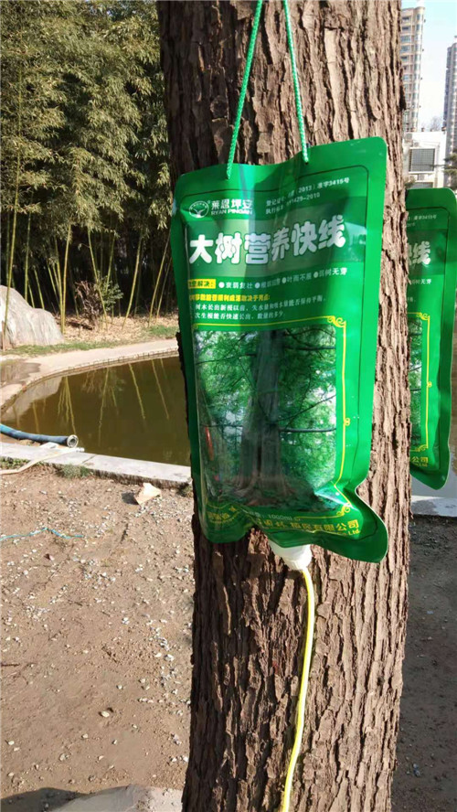 3月18日,記者在市教體局院里看到,幾棵樹上都掛著一個(gè)綠色的塑料袋,塑料袋上寫著“大樹營養(yǎng)快線”,袋口向下連著一個(gè)導(dǎo)管,導(dǎo)管與普通的輸液器非常相像,只是在中間的位置分成了兩根,分出來的兩根導(dǎo)管末端各連著一個(gè)針頭,針頭插進(jìn)大樹接近樹根的位置。據(jù)悉,這些“營養(yǎng)快線”可以為樹木補(bǔ)充營養(yǎng)和水分,促進(jìn)樹木生根、發(fā)芽,幫助樹木增強(qiáng)抗病能力,提高樹木的成活率,保證樹木整體長勢(shì)。