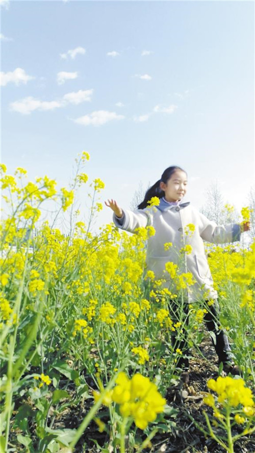 3月31日,記者在中心城區(qū)慶豐路與政通路交叉口附近看到,一位市民帶著孩子在盛開(kāi)的油菜花里游玩、拍照,盡享春日美景。記者 關(guān)秋麗 攝