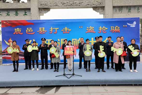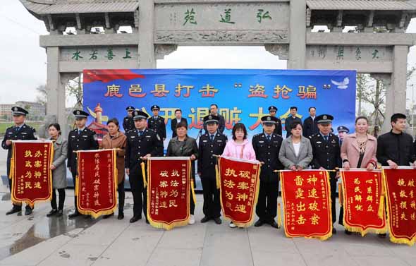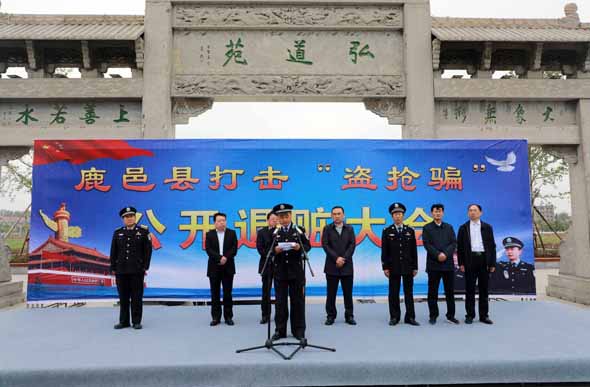 4月25日上午,鹿邑縣召開打擊“盜搶騙”專項行動公開退贓大會。縣委常委、政法委書記侯自峰出席會議并講話。縣公、檢、法、司等有關(guān)部門負責人與群眾代表近300人參加退贓大會。