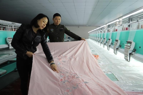 同時,城郊鄉(xiāng)發(fā)揮基層黨員干部和在外創(chuàng)業(yè)成功人士的廣泛人脈資源和經(jīng)濟優(yōu)勢,引導社會投資發(fā)展產(chǎn)業(yè)助力脫貧攻堅。谷集行政村美紡科技有限公司就是典型個例。石永紅、石永華、石磊姐弟3人來自江蘇南通,他們盯上了城郊鄉(xiāng)的富余勞動力,投資800萬元建設(shè)了近2000平方米的紡繡車間,20臺國內(nèi)先進設(shè)備可以利用全電腦操作繡出12種顏色的繡品。車間固定用工34人,其中建檔立卡貧困戶2人。只需要看著電腦控制臺、換布貼布、穿針引線,每人每天工資便可達到150元。