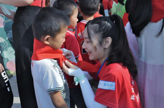 開班儀式上,鄭州升達(dá)經(jīng)貿(mào)管理學(xué)院的支教老師為同學(xué)們佩戴了紅領(lǐng)巾,伴隨著國歌進(jìn)行了升國旗教育,支教老師進(jìn)行集體宣誓。支教老師代表作表態(tài)發(fā)言時(shí)說:“很高興能夠來鹿邑周樓小學(xué)支教,作為一名當(dāng)代青年大學(xué)生,我們能夠擔(dān)當(dāng)重任,吃苦耐勞,全身心地完成兩周的支教活動,與孩子們快樂相處。”