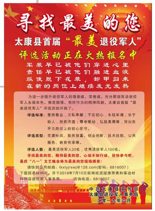 為進(jìn)一步提升退役軍人的尊崇感、榮譽(yù)感,充分展現(xiàn)全縣退役軍人永葆本色、奮發(fā)圖強(qiáng)、有所作為的精神風(fēng)貌,太康縣委宣傳部、太康縣退役軍人事務(wù)局從即日起聯(lián)合開(kāi)展首屆“最美退役軍人”評(píng)選活動(dòng),對(duì)全縣退役軍人中涌現(xiàn)出來(lái)的黨建標(biāo)兵、脫貧致富、創(chuàng)業(yè)創(chuàng)新、技術(shù)技能、公共服務(wù)、教育傳承等方面典型代表進(jìn)行評(píng)選表彰。
