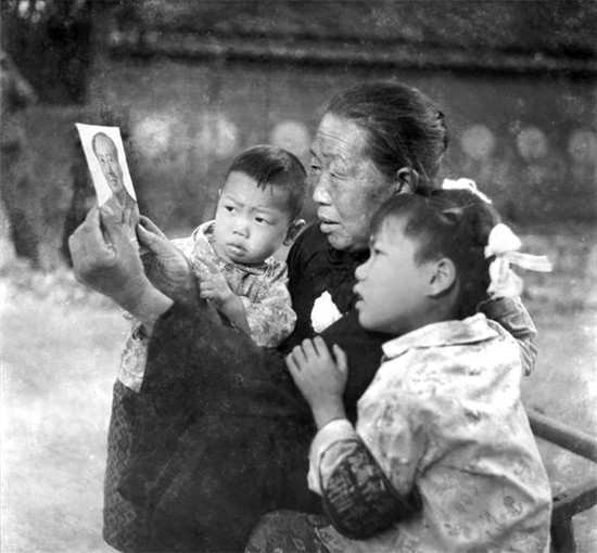 1976年9月,全國(guó)上下沉浸在毛主席逝世的悲痛中,老人為孩子戴上白布花,對(duì)著毛主席照片說(shuō)心里話。