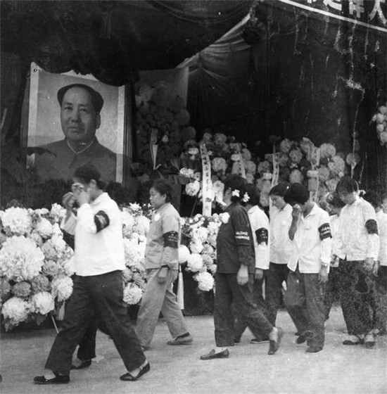 廣播喇叭一直轉(zhuǎn)播著中央人民廣播電臺(tái)的節(jié)目,哀樂(lè)一遍遍響起,回蕩在大街小巷、城鎮(zhèn)鄉(xiāng)村,大家不約而同地佩戴黑紗,自發(fā)做白花、扎花圈、寫挽聯(lián),商店里的白紙和黑布都賣缺了。機(jī)關(guān)單位的同志在自己布置起來(lái)的靈堂里悼念毛主席,學(xué)生每天上課之前都向毛主席默哀,工廠里掛起了“繼承毛主席遺志,抓革命、促生產(chǎn)”的橫幅,農(nóng)民佩戴著黑紗在田野里勞動(dòng)。