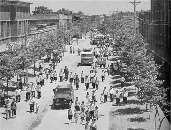 1975年6月,西華縣城唯一的一條硬化路面大街,現(xiàn)在的箕城路。 1975年5月,新華社一名攝影記者來(lái)到河南,從鄭州花園口到周口商水、西華、太康、扶溝、淮陽(yáng),歷時(shí)一個(gè)半月采訪拍攝黃泛區(qū)現(xiàn)狀。途徑地政府安排當(dāng)?shù)財(cái)z影家與其共同拍攝,周口攝影家葛慶亞、李中華、岳獻(xiàn)甫參與了拍攝。受政治環(huán)境影響,這批圖片推遲到1979年才集結(jié)成冊(cè),由外文出版社分英文、法文、西班牙文三種語(yǔ)言出版。當(dāng)時(shí),外文出版社隸屬出版總署,由中共中央宣傳部領(lǐng)導(dǎo),出版了大量的外宣圖書贈(zèng)送外國(guó)駐華領(lǐng)事館。 (圖片來(lái)源:圖書《Former yellow river flood area transformed》中文名《黃泛區(qū)變化》)