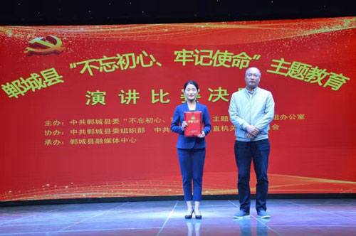 10月29日下午,由中共鄲城縣委“不忘初心、牢記使命”主題教育領(lǐng)導(dǎo)小組辦公室主辦,鄲城縣委組織部、縣直機(jī)關(guān)工委協(xié)辦,縣融媒體中心承辦的“不忘初心、牢記使命”主題教育演講比賽決賽舉行,鄲城縣委常委、組織部長(zhǎng)、縣委“不忘初心、牢記使命”領(lǐng)導(dǎo)小組辦公室主任侯磊等出席并為獲獎(jiǎng)?wù)哳C發(fā)獎(jiǎng)?wù)伦C書。