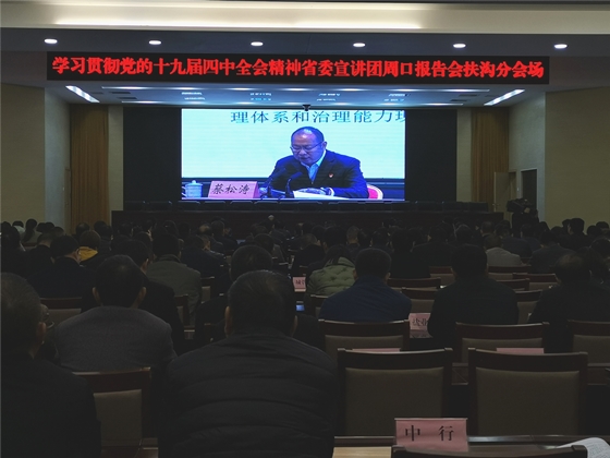 根據(jù)省委統(tǒng)一部署,11月27日,學(xué)習(xí)貫徹黨的十九屆四中全會(huì)精神省委宣講團(tuán)報(bào)告會(huì)在周口市舉行,扶溝縣四個(gè)班子領(lǐng)導(dǎo)和縣直各單位負(fù)責(zé)人在扶溝分會(huì)場(chǎng)聆聽(tīng)宣講報(bào)告。