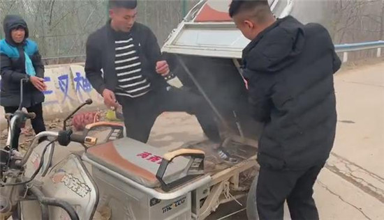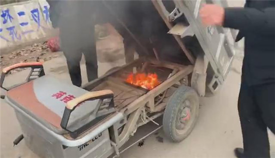 “當(dāng)時在我們前方的一輛電動三輪車駕駛座下冒出黑煙,車上兩位老人察覺到危險后,急忙下車,站在一旁不知所措。我們也緊跟上前。事發(fā)突然,現(xiàn)場沒有滅火器和可利用水源,而三輪車的火越來越大,兩位老人著急萬分,在旁邊不停地請求我們幫幫她們。根據(jù)經(jīng)驗,我們當(dāng)機(jī)立斷利用路邊的泥土進(jìn)行撲救,經(jīng)過幾十秒的緊張撲救,著火部位被成功撲滅?!比幌狸爢T回憶說三輪車是電線短路引起的電瓶著火。