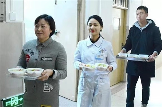 餃子煮好,盛入碗內,端入病房,親手送到患者手中,看到患者品嘗餃子時的開心樣子,醫(yī)護人員從心里笑到了臉上。