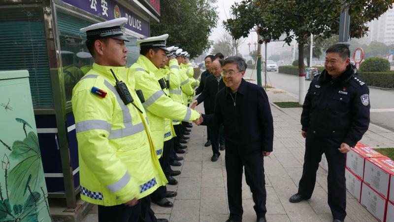 慰問中,皇甫立新、劉國慶一行首先來到縣交警大隊城區(qū)中隊五岔路口執(zhí)勤點,同正在執(zhí)勤的交通民警一一握手,并代表縣委、縣政府向交警大隊全體民警、協(xié)警一年來付出的努力和辛苦表示感謝和問候,囑咐他們要注意安全,保重身體。在詳細(xì)了解了春節(jié)期間治堵保暢工作情況匯報后,皇甫立新對交警大隊全體民警和輔警在春節(jié)期間放棄和家人團聚,舍小家顧大家,堅守在道路交通安全管理崗位的工作態(tài)度,以及主動作為,敢于擔(dān)當(dāng),無私奉獻、任勞任怨的工作作風(fēng)給予高度肯定。并希望大家在春節(jié)期間,繼續(xù)發(fā)揚吃苦耐勞的精神,全力做好道路安全保障工作,確保春節(jié)期間全縣道路交通安全暢通,讓全縣人民度過一個平安、祥和的春節(jié)。同時,縣交警大隊要進一步做好執(zhí)勤民警后勤保障及防寒保暖工作,加強人員輪換上崗,切實保障公安交警切身利益,解決他們的后顧之憂。