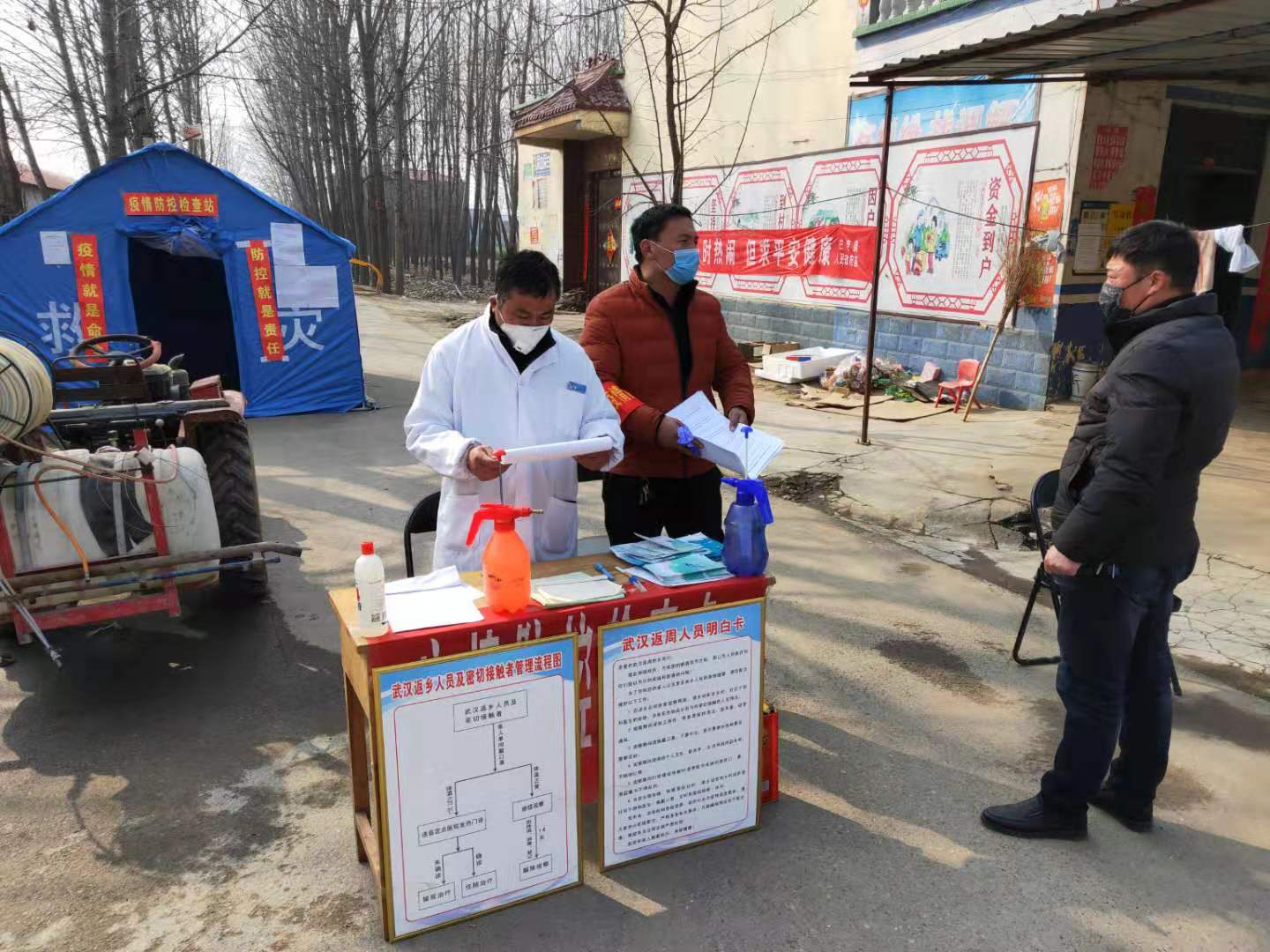 記者在該鎮(zhèn)順便走到幾卡點(diǎn)看到:每個(gè)卡點(diǎn)都搭有帳篷,插一面黨旗,有人員值守,有進(jìn)出人員登記冊,有消毒液,有電子溫度計(jì),張貼有告知書,懸掛有《武漢返周人員明白卡》《返鄉(xiāng)人員及密切接觸者管理流程圖》等。